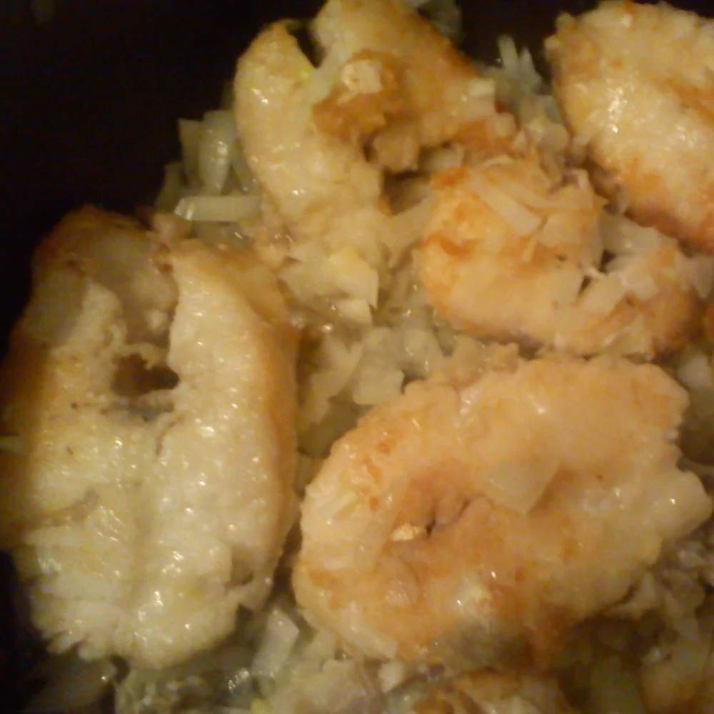 ШАГ 6 Лук нарезать полукольцами и выложить его поверх рыбы.