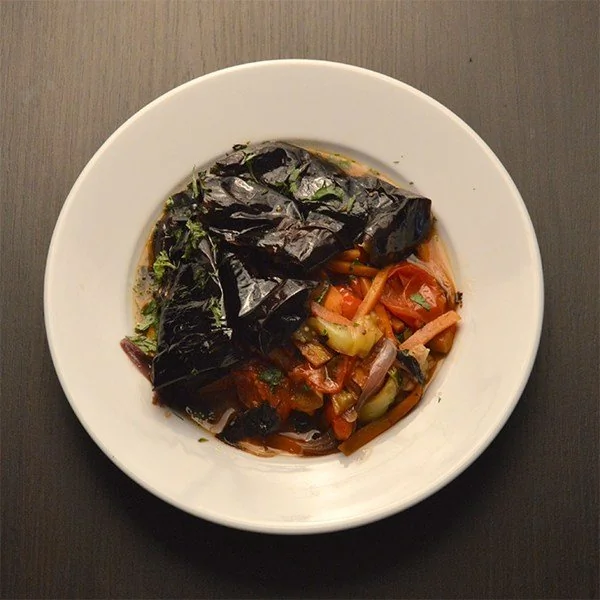 ШАГ 8 Выложить поверх зелени баклажаны кожей вверх. Томить под крышкой на маленьком огне 20 минут. Перед подачей посыпать свежей зеленью.