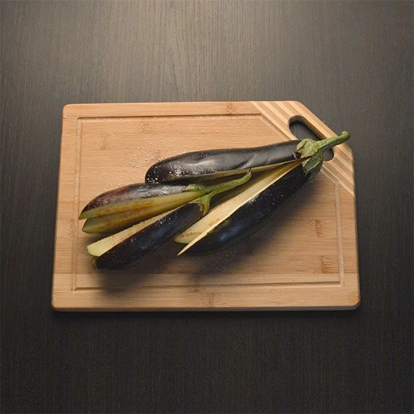 ШАГ 1 Разрезать баклажан на 4 части, сохранив плодоножку, обсыпать крупной солью, оставить до выделения влаги на срезах. Когда из баклажанов начнет выделяться сок, их необходимо быстро сполоснуть в холодной проточной воде, и обтереть бумажным полотенцем (чтобы не успели впитать воду).