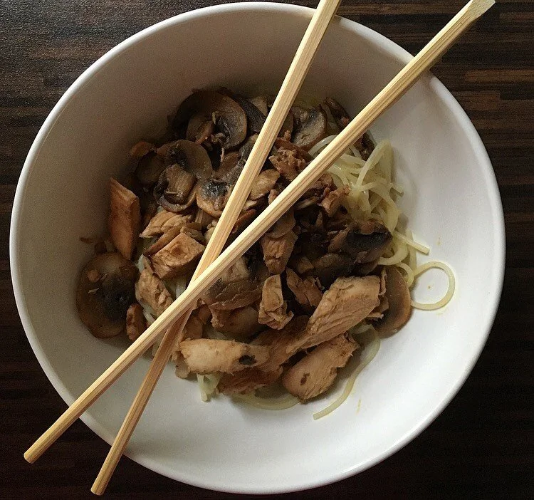 ШАГ 5 Добавить соус к лапше. Добавить курицу с грибами.