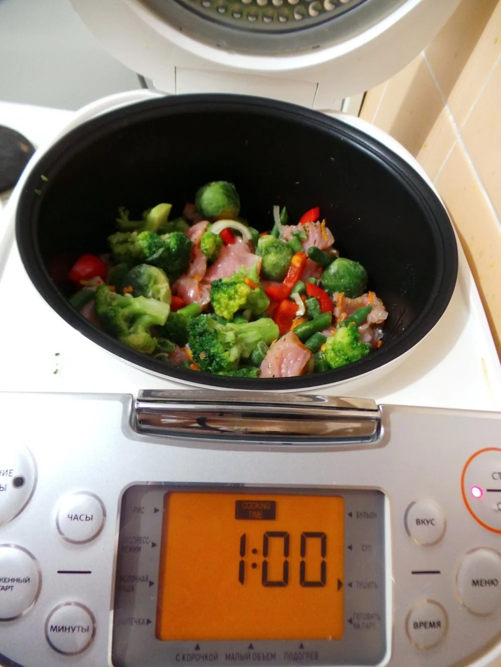 ШАГ 4 Взять овощи (это может быть смесь, может быть отдельно: брокколи, цветная капуста, стручковая фасоль, брюссельская капуста) и так же выложить в чашу, туда же добавить нарезанный болгарский перец.
