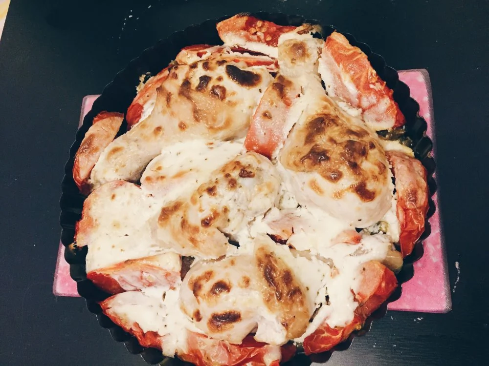 ШАГ 4 В форму для запекания выложить овощную смесь, сверху положить курицу, томаты, нарезанные крупными дольками.