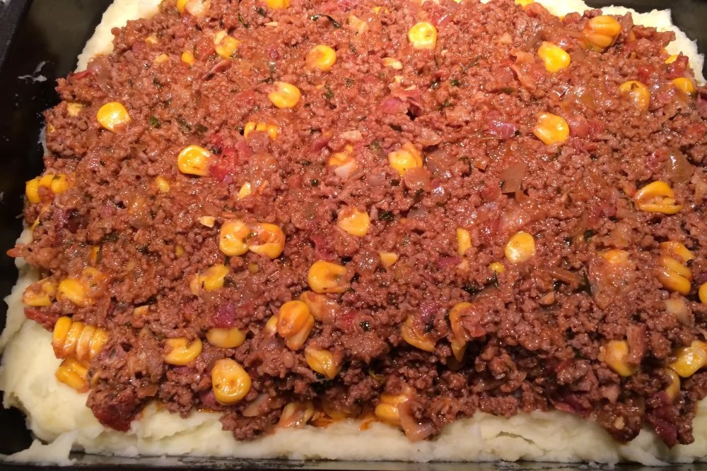 ШАГ 5 Добавьте сушенную мяту, мускатный орех и эстрагон и тушите еще 2–3 минуты. Если у вас есть готовая кукуруза в вакууме, то положите зерна, снятые с початка, на этом этапе. Итоговое состояние фарша должно быть не очень сухим, но и не растекаться. Иначе не удастся его выложить аккуратно в запеканку.