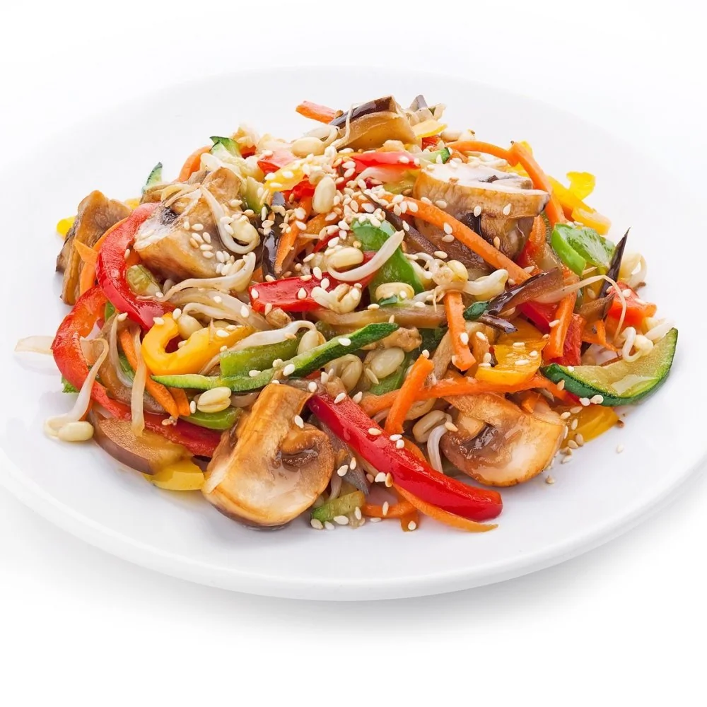 ШАГ 1 Нарезать тонкой соломкой кабачки, баклажаны, морковь и перец. Смешать с нарезанными грибами и ростками сои.