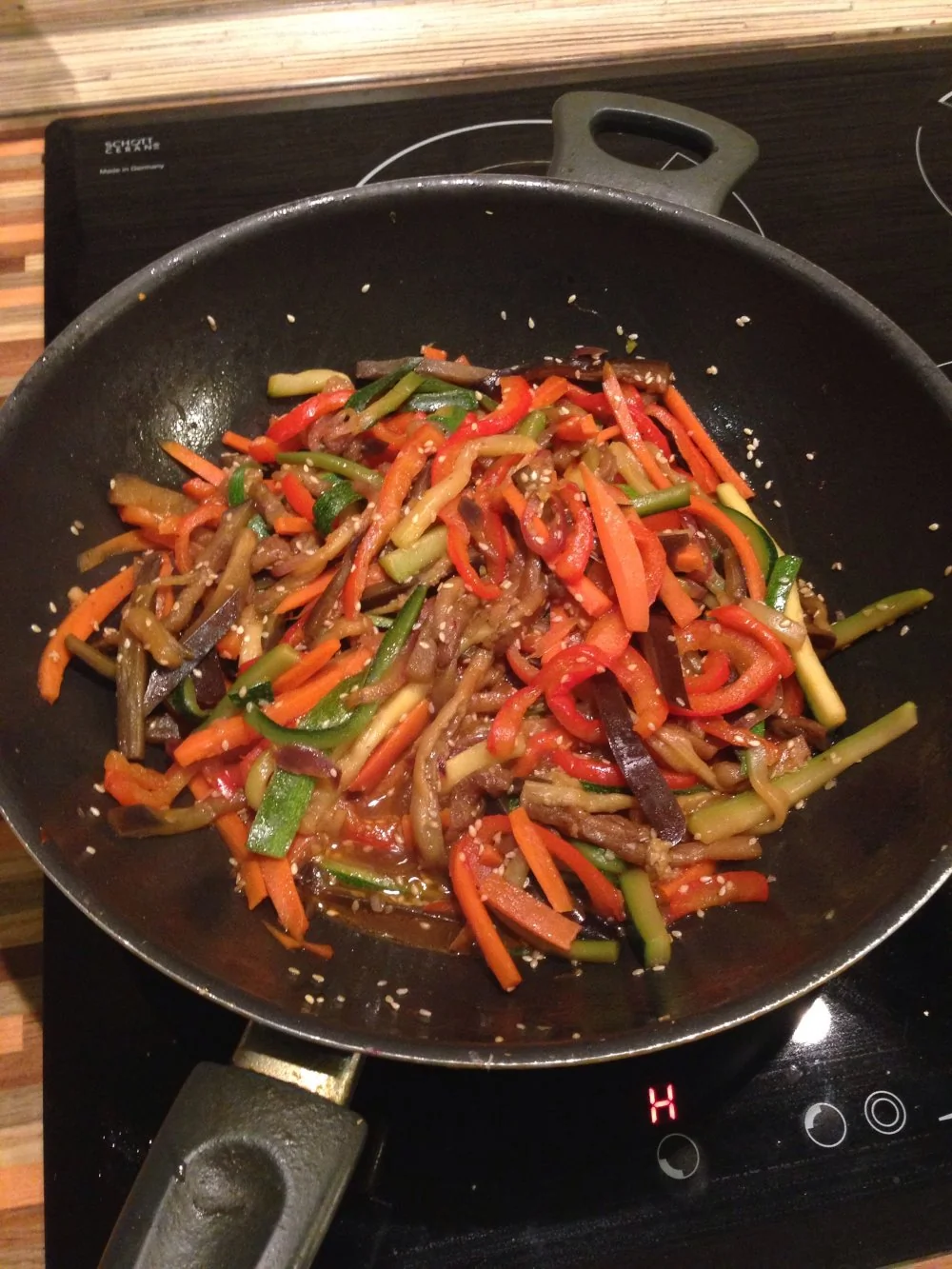 ШАГ 2 Обжаривать несколько минут на воке или на хорошо прогретой чугунной сковороде с парой ложек кунжутного масла, постоянно помешивая.