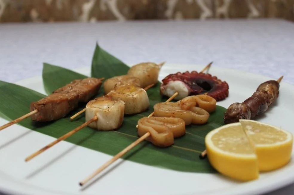 ШАГ 2 Нарежьте маленькими кусочками лук-порей, тунца, кальмара и осьминога. Куриные сердечки и гребешки можно использовать целыми. Перемешайте все в маринаде и оставьте на 5 минут при комнатной температуре. Насадите все ингредиенты на шпажки. Оставшийся маринад не выливайте — он нам еще пригодится.