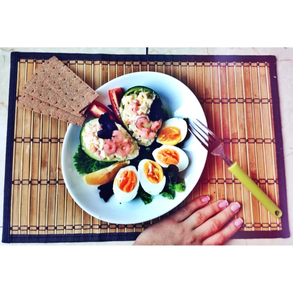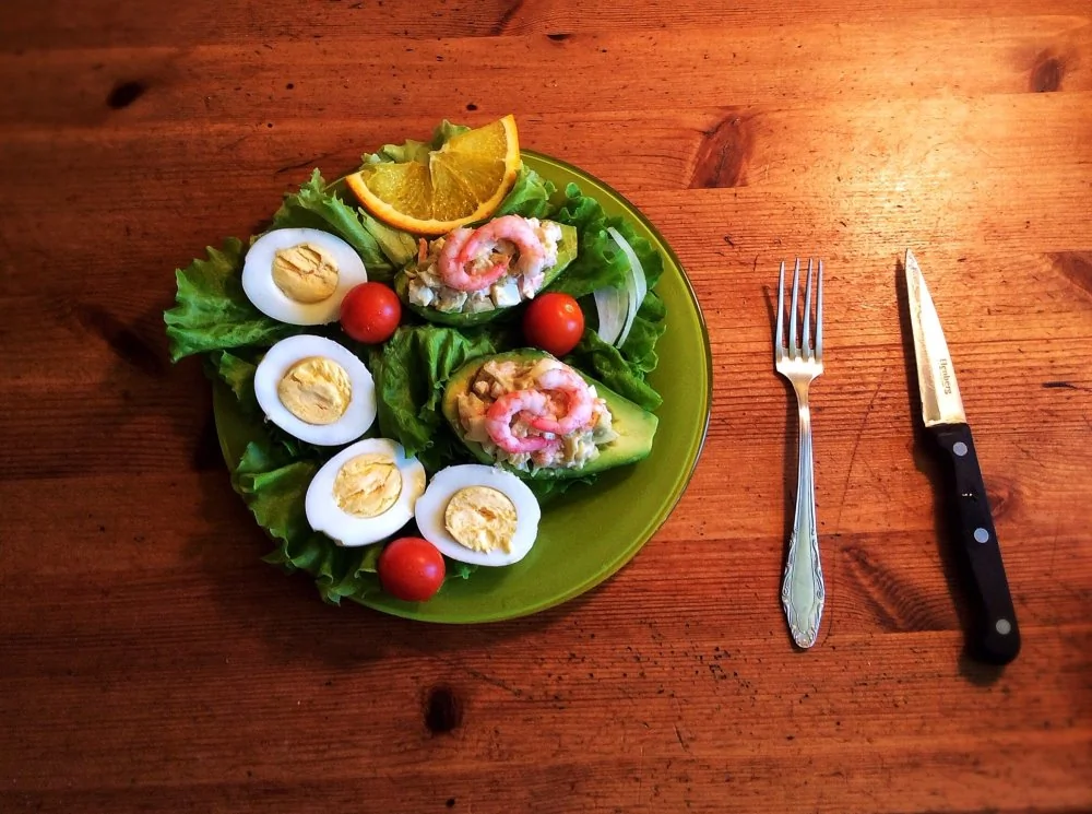 Авокадо с яйцами и креветками