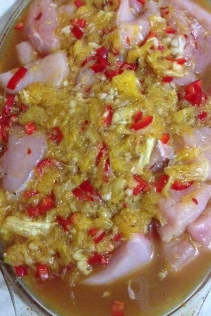 ШАГ 2 Выдавить сок из апельсинов и половинки лайма, можно добавить мякоти. добавить раздавленый чеснок, мелко нарезанный чили, специи и соевый соус (количество соуса зависит от того вкуса, какой вы хотите получить: если более соленый, то побольше, а если только оттенить аромат цитрусовых, то хватит пары столовых ложек).