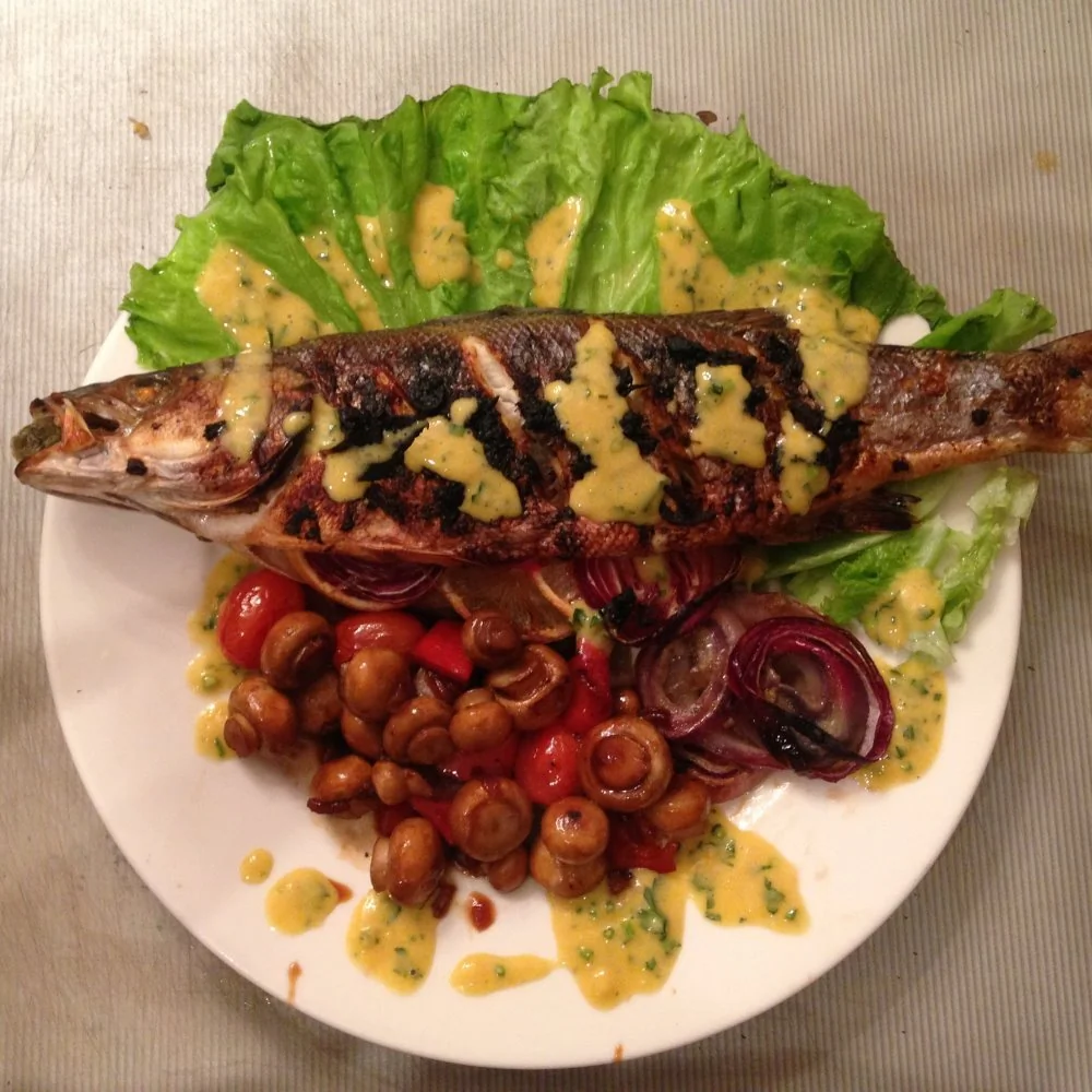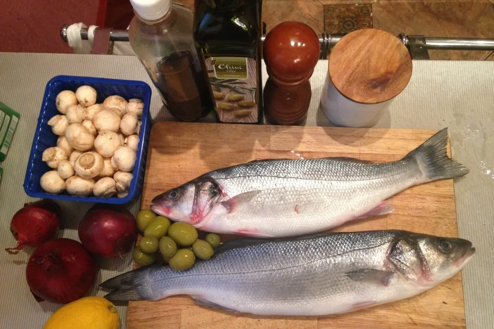 После делаю маринад из 1 мелко нарезанной луковицы, 1/3 лимона, нарезанных оливок, 3 ложки столовые терияки и оливкового масла, соль, перец по вкусу и чуть приправы для рыбы, которая продается в каждом магазине. Весь этот замес — в ступку, и мешу до однородной массы (жаль нет блендера). На рыбе делаю поперечные надрезы, чтобы лучше пропиталась маринадом. После беру противень, чуть смазываю маслом и на дно режу лук кольцами для того, чтобы рыба не пригорала к дну. Натираю сибас всей массой из ступки со всех сторон, в надрезы и брюшко. В брюшко нарезаю лук и лимон кольцами (но не режьте весь лимон, оставьте треть для соуса). И маленькая изюминка — пасть положите оливку. Все отправьте в духовку с грилем на среднюю полку на 20 минут. Не знаю, у кого какой гриль, так что советую поглядывать, чтобы не горела.