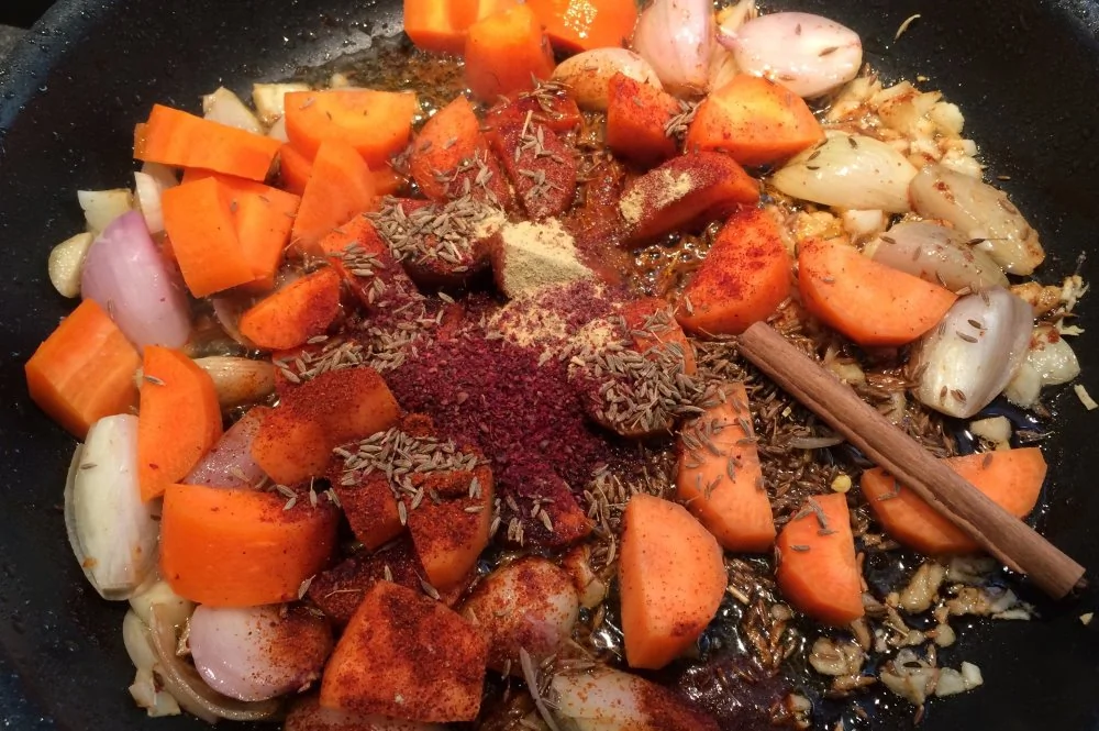 ШАГ 11 Добавьте морковь. Имбирь, зиру, сумах, паприку, палочку корицы и рас-эль-ханут.