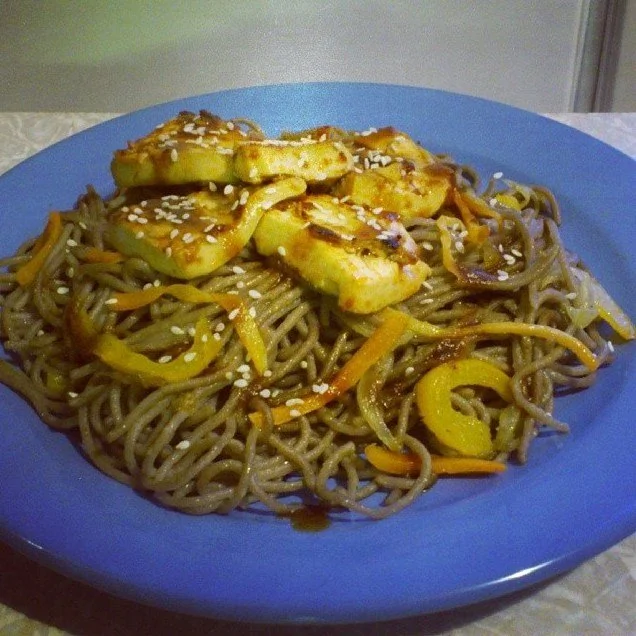 Лапша соба с овощами и сыром тофу под соусом терияки