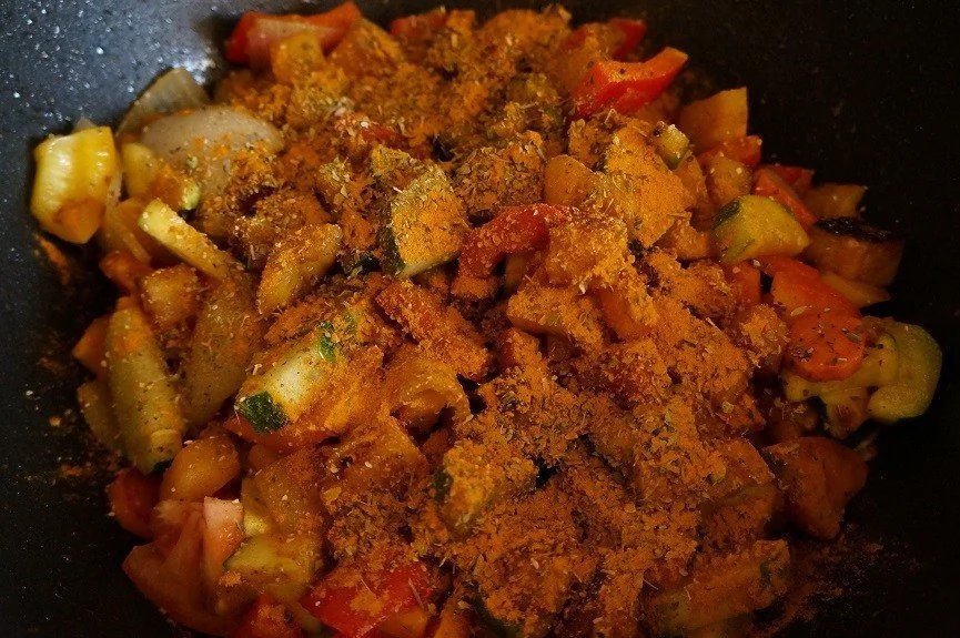 ШАГ 7 Нарезать крупно помидор и добавить в вок — помидор даст сок и жарка перейдет в процесс тушения.