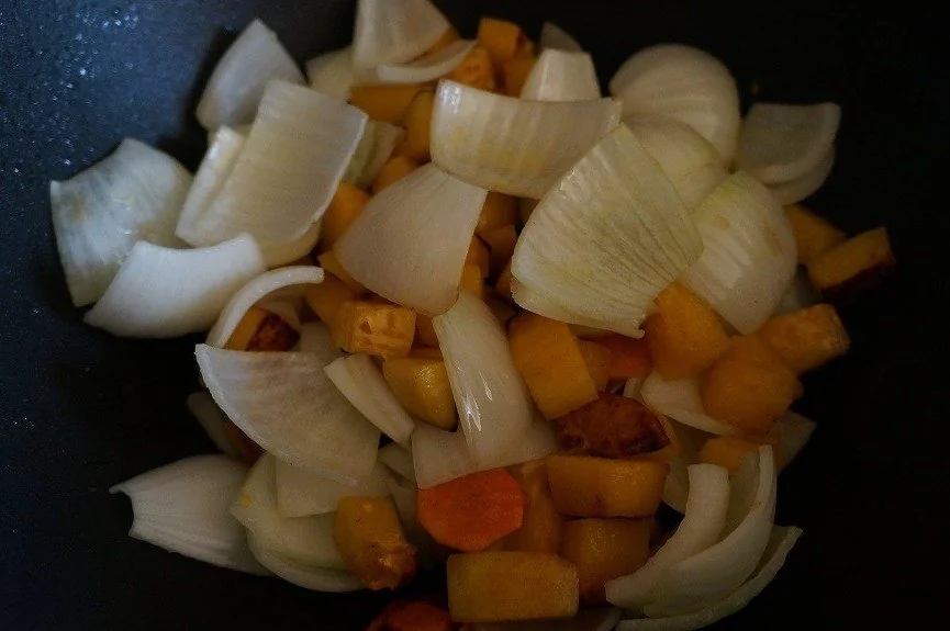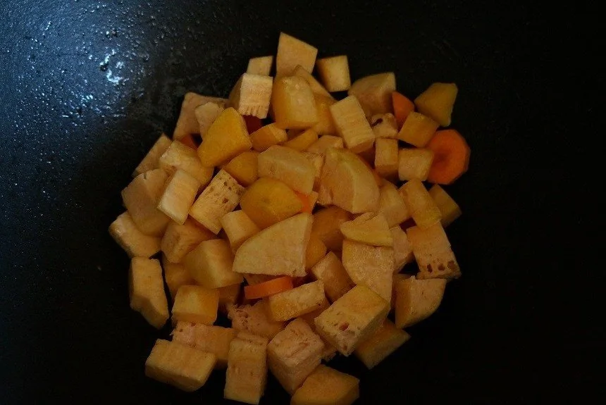 ШАГ 2 Нарезать кубиками и обжарить батат.