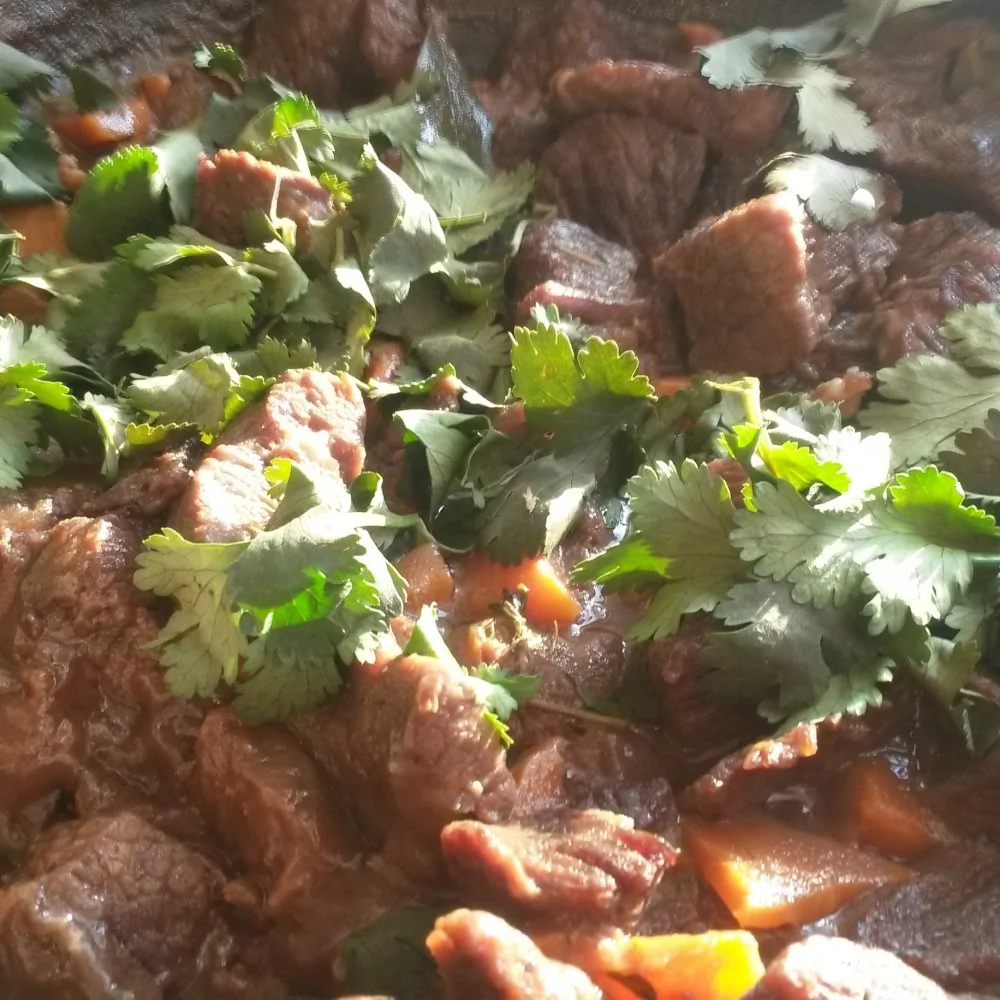 ШАГ 5 Кода мясо будет готово, посыпьте его листьями кинзы, молотым перцем и подавайте с картофельным пюре и свежими овощами.