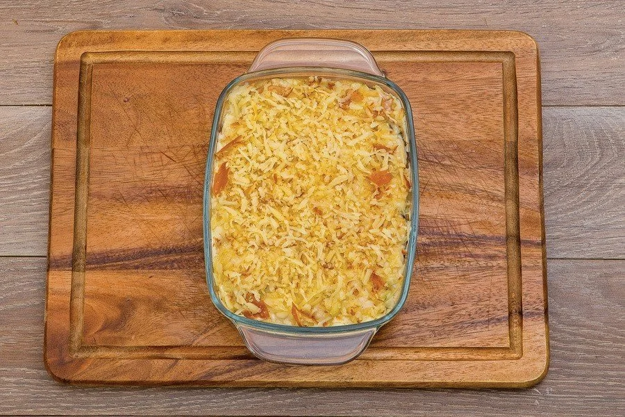 ШАГ 6 Выложите в форму для запекания слоями баклажаны и цукини, фарш, помидоры, залейте соусом и поставьте в заранее разогретую до 200 градусов духовку на 10 минут, достаньте форму, посыпьте натертым сыром и отправьте в духовку ещё на 10 минут.
