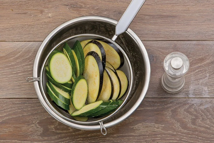 ШАГ 1 Нарежьте цукини и баклажаны на диски толщиной около 6 мм, присыпьте их солью, положите в дуршлаг и оставьте на 30 минут, чтобы из них вышла горечь.