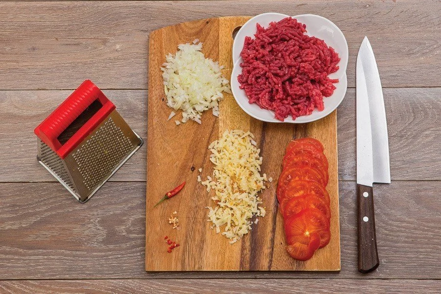 ШАГ 2 Прокрутите мясо через мясорубку; очистите и нарежьте лук мелко, нарежьте помидор кольцами, разрежьте перец чили вдоль, вычистите семена, мелко нарубите половину чили перца; натрите сыр на крупной терке.