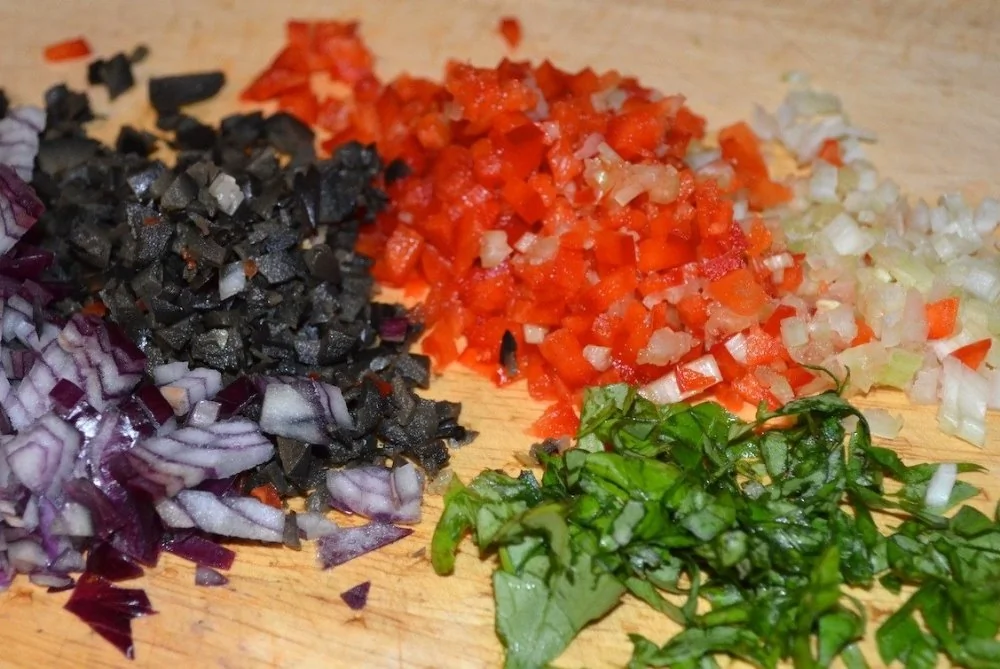 ШАГ 2 Красный лук, оливки (предварительно выдавить косточки), перец болгарский красный (1/4 часть), 1 стебель сельдерея порубить очень (!) мелко. Не переборщите с мятой!