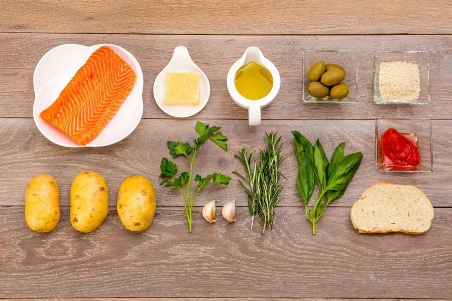 Ингредиенты для приготовления Филе семги с базиликом, оливками и картофелем: