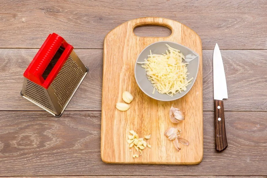 ШАГ 3 Очистите чеснок, из 1 зубчика выньте сердцевину, остальные раздавите плоской стороной ножа; натрите пармезан на крупной терке.