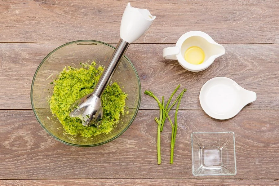 ШАГ 4 Соедините листья петрушки и базилика, добавьте отжатый хлеб, сухари и измельчите в блендере; посолите, поперчите, добавьте 2 столовые ложки оливкового масла, пармезан, зубчик чеснока без сердцевины и еще раз все пробейте.