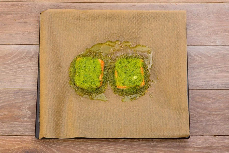 ШАГ 5 Разрежьте рыбу пополам; смажьте каждый кусок семги зеленым соусом и выложите на противень соусом вниз; сверху смажьте рыбу более тонким слоем соуса; запекайте рыбу в разогретой духовке первые 5 минут при температуре 220 градусов, затем убавьте температуру до 160 градусов и запекайте еще 3 минуты.
