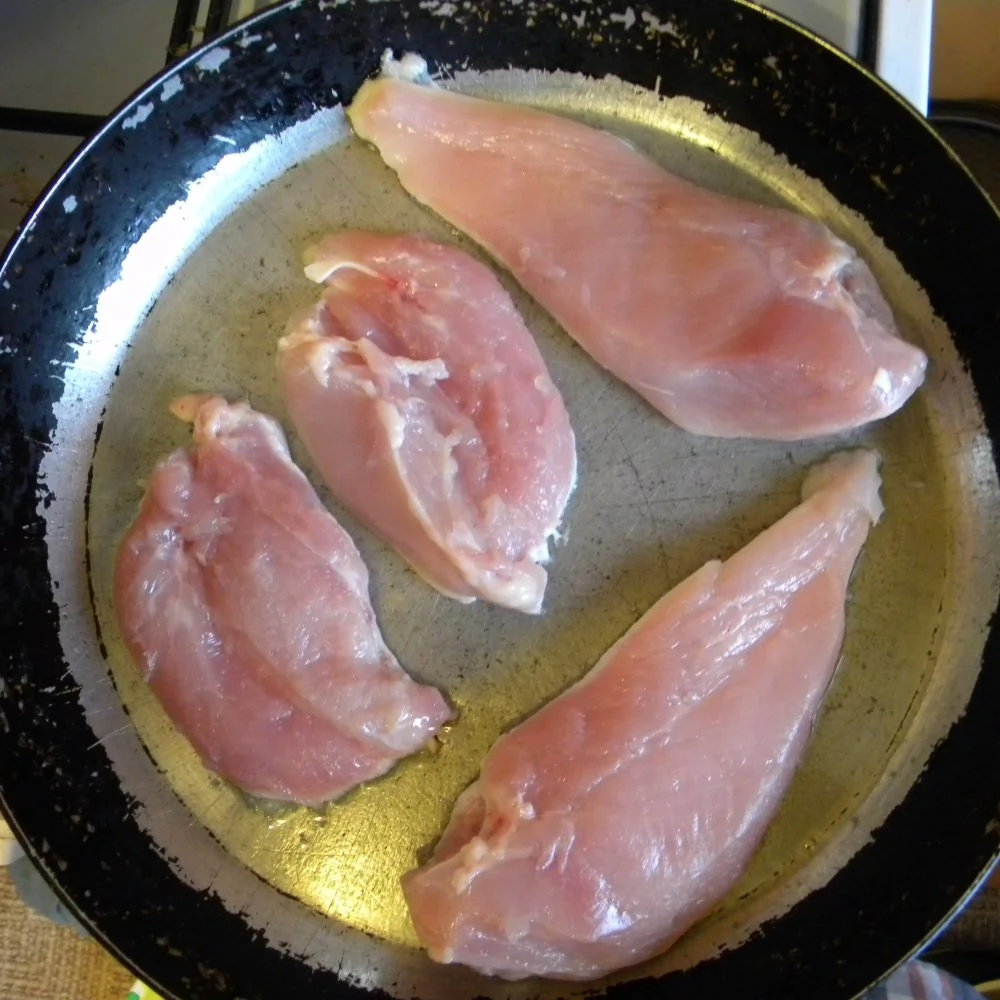 ШАГ 2 В большой сковороде разогрейте 3 столовые ложки оливкового масла. Обжарьте курицу по 7 минут с каждой стороны. Приправьте солью, перцем.