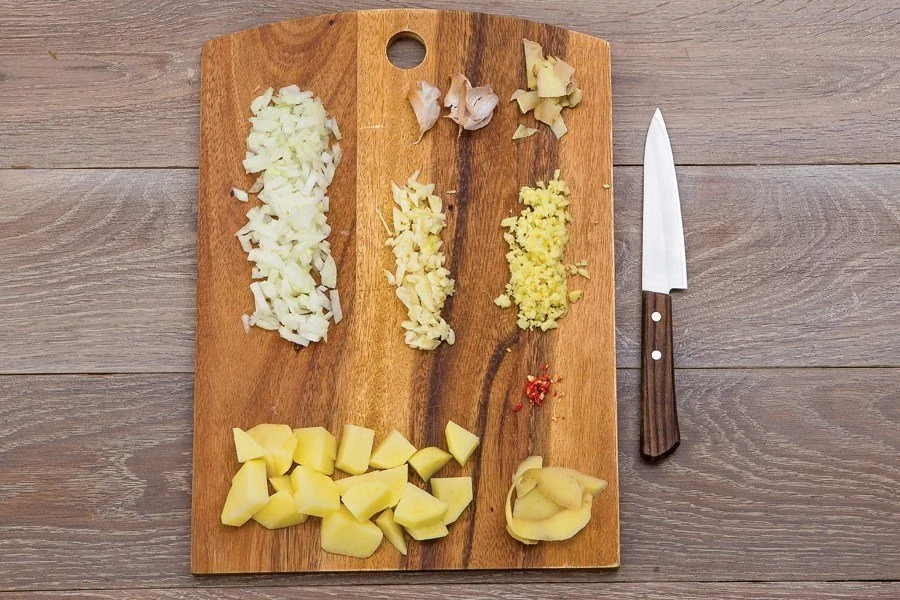 ШАГ 1 Положите лепешки в морозилку на 15 минут; очистите и нарежьте картофель небольшим кубиком, очистите, нарежьте лук мелким кубиком, раздавите, очистите и нарубите чеснок крупно, очистите, нарежьте имбирь мелко, разрежьте перец чили вдоль, половину чили перца нарежьте очень мелко