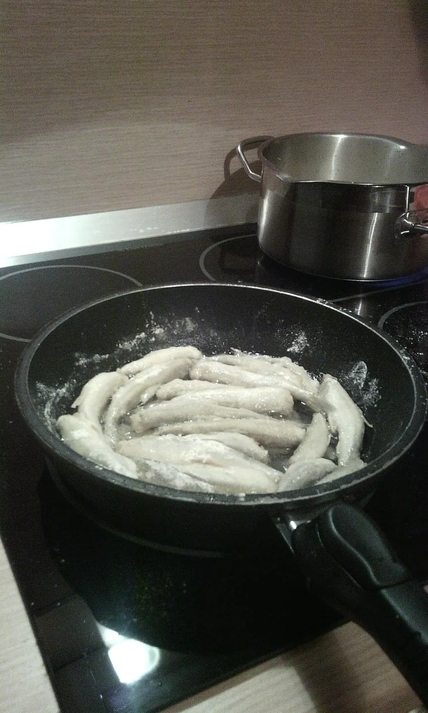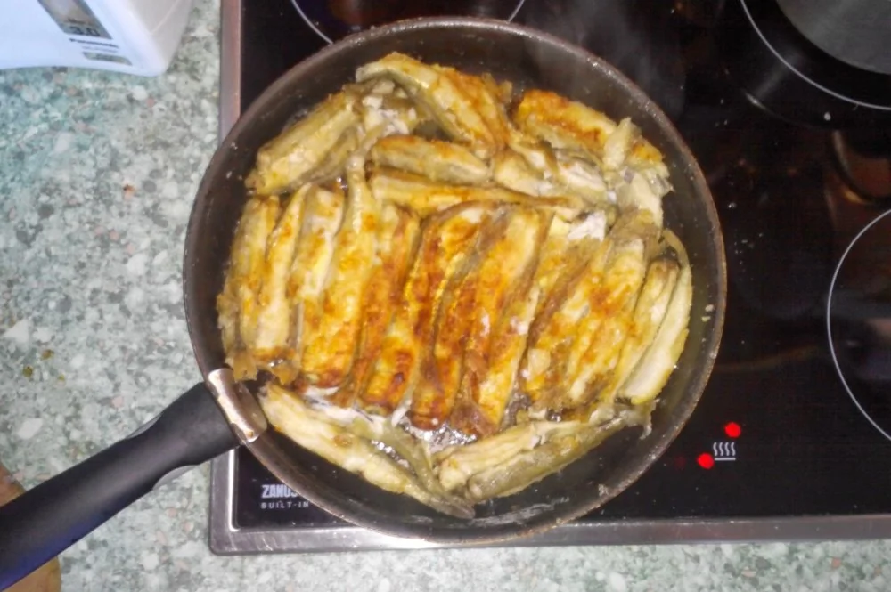 ШАГ 4 Берем сковороду побольше, разогреваем ее с маслом и укладываем рыбку «валетом» для того, чтобы минут через 10–15 перевернуть сразу всю, а не по одной рыбке. Жарим на полном огне, переворачиваем только один раз!