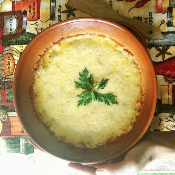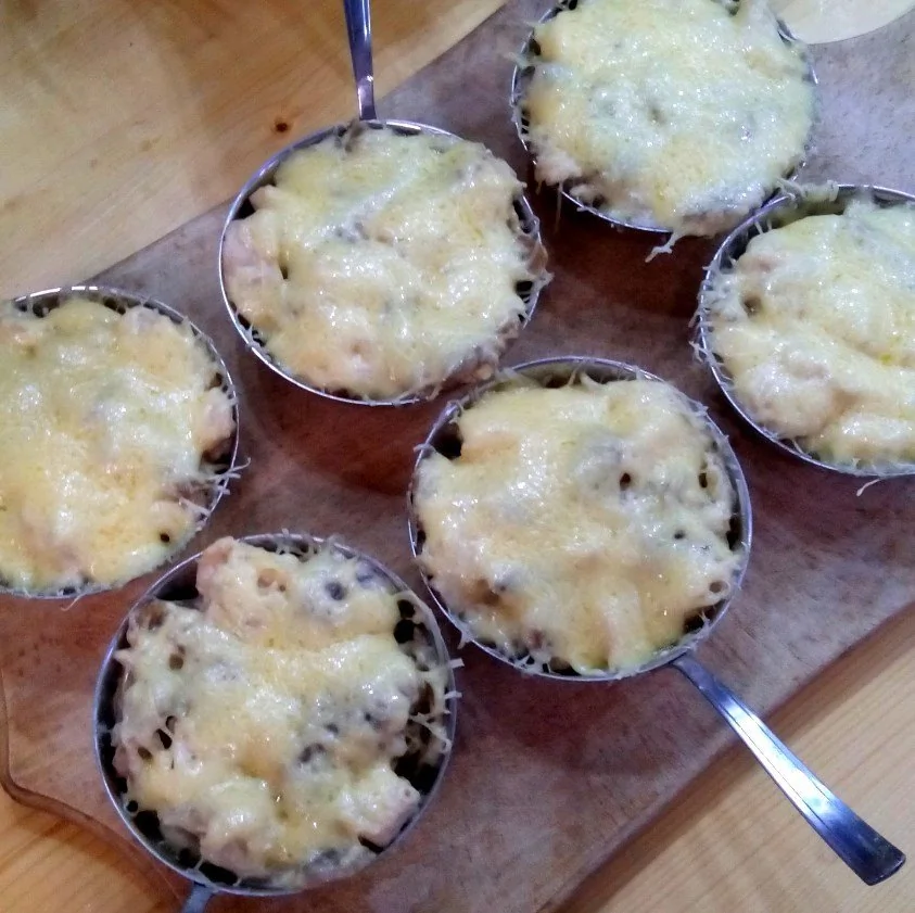 ШАГ 7 Разложить полученную массу в кокотницы, сверху посыпать тертым сыром. Запекать в духовке до золотистой корочки при температуре 180 градусов (около 30 минут).