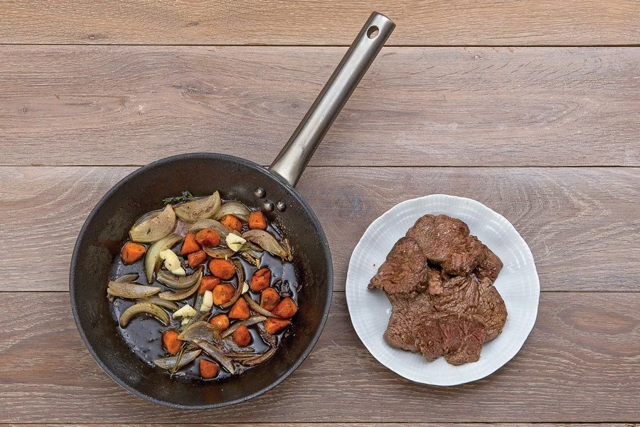 ШАГ 6 Переложите мясо на тарелку, добавьте чеснок к овощам и жарьте на слабом огне в течение еще 4-х минут.