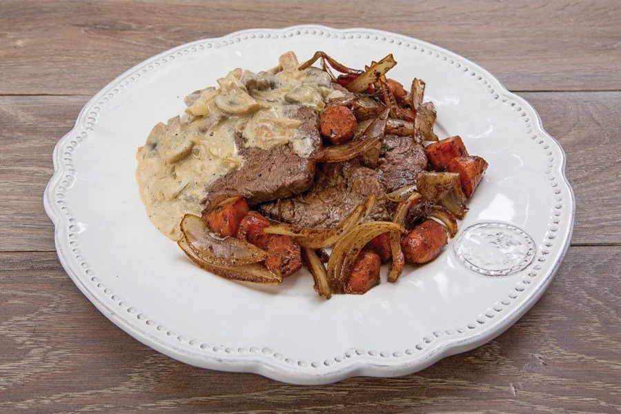 ШАГ 7 Выложите мясо на тарелку, сверху полейте соусом, рядом выложите овощи и подавайте.