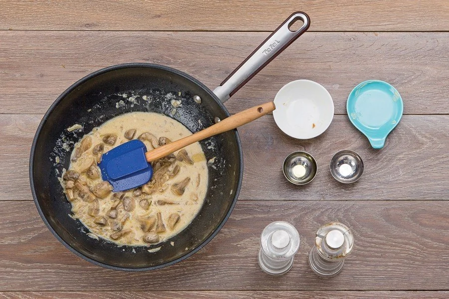 ШАГ 4 Растопите сливочное масло и обжарьте мелко нарубленный лук шалот на среднем огне в течение 2-х минут, добавьте грибы и обжаривайте еще 2 минуты, помешивая, уменьшите огонь, добавьте сметану, сахар, половину чеснока, 50 мл воды и тушите 5 минут, поперчите, посолите, снимите с плиты, влейте трюфельное масло, перемешайте