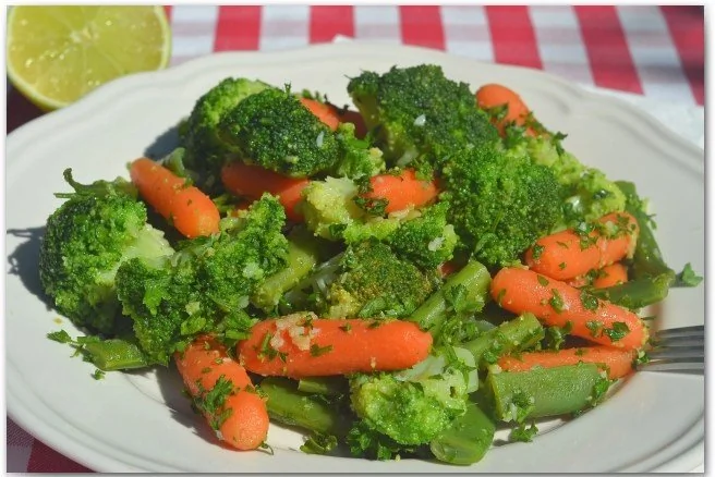 ШАГ 8 Перекладываем овощи в глубокую тарелку, солим, добавляем петрушку и лимонный сок.