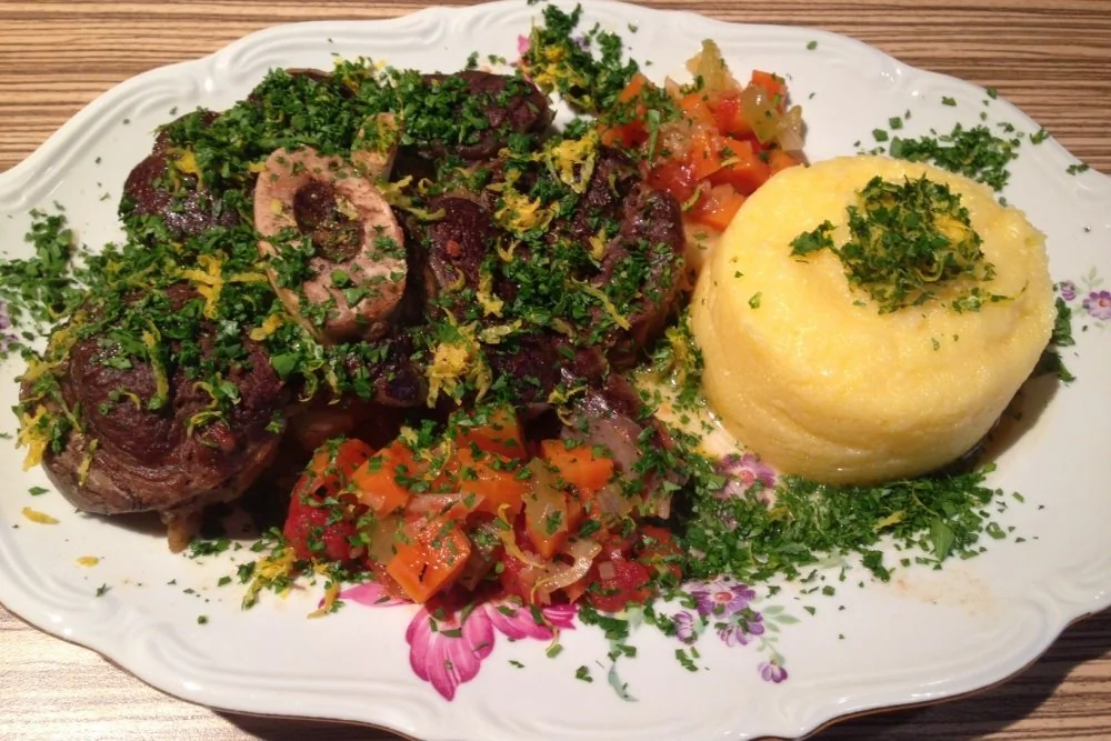 ШАГ 7 При подаче можно гарнировать протушенными с мясом овощами, а также смесью мелко нарубленной петрушки и свеже натертой лимонной цедры.
