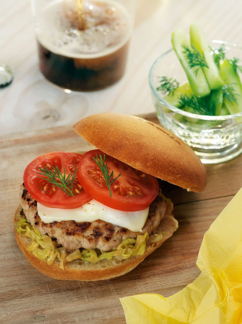 Филе кролика Сливки 33%-ные Майонез Кетчуп Горчица Вустерширский соус Латук Сыр моцарелла Помидоры Огурцы Сок лайма Оливковое масло extra virgin Укроп Растительное масло Булочка для гамбургеров Соль Перец черный молотый Основные блюда Не