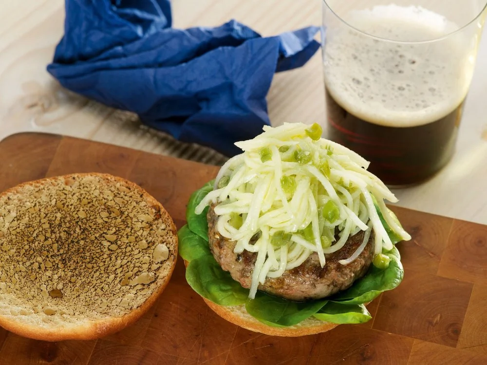 ШАГ 4 Булочки разрезать надвое. На нижние половины выложить шпинат, потом котлеты, добавить кольраби и заправку с васаби — и накрыть верхними половинами булок.