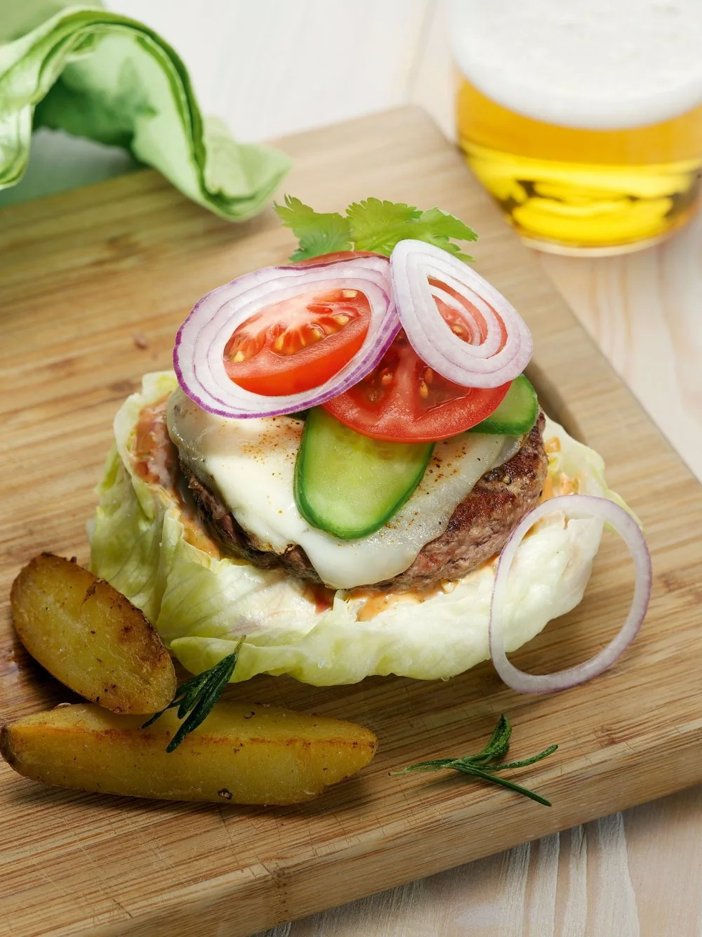 ШАГ 5 Кочаны айсберга разрезать на четыре части каждый. Четыре четвертинки намазать перечным соусом, затем выложить по котлете. На оставшиеся четвертинки поместить нарезанные огурцы, помидоры и лук, а также кинзу.