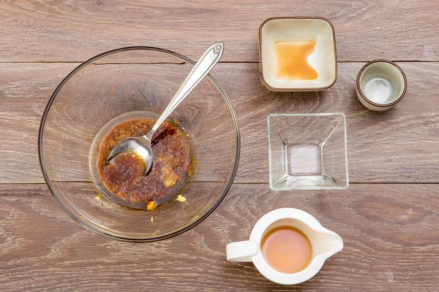 ШАГ 2 Смешайте половину имбиря с половиной кунжутного масла, добавьте соевый соус, сок лайма и тростниковый сахар, размешайте до растворения сахара.