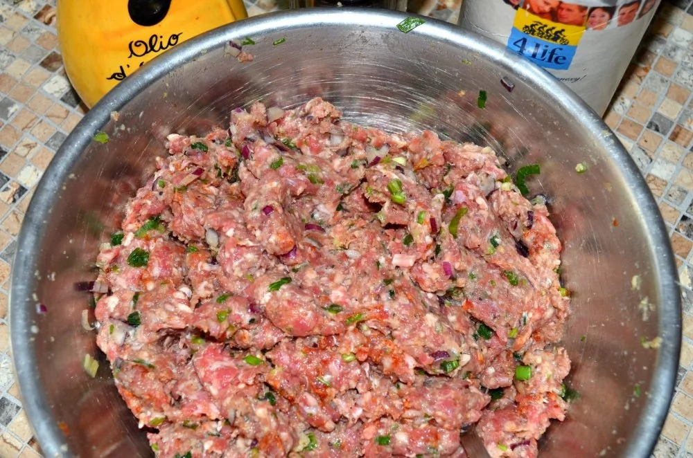 ШАГ 3 В миску с хлебом добавить взбитое яйцо, порубленную зелень, измельченный перец чили, специи (паприка, соль, перец), измельченный томаты, все перемешать. Выложить в миску свежий говяжий фарш, выдавить пару зубчиков чеснока. Теперь все хорошо вымесить.