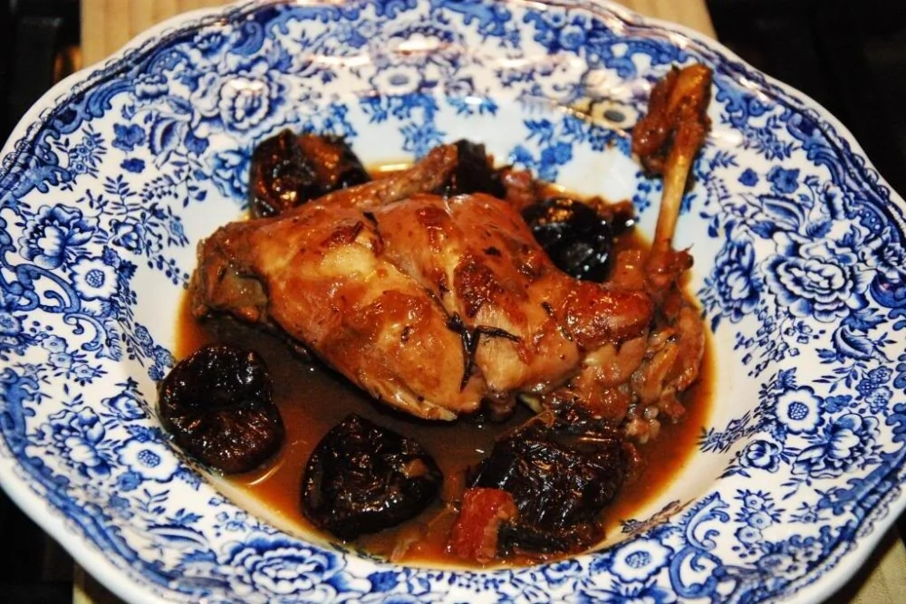 ШАГ 2 В глиняной (фаянсовой) кастрюле разогрейте оливковое масло, добавьте розмарин и лавровый лист. Разделайте кролика на примерно одинаковые куски, переложите в кастрюлю и дайте подрумяниться со всех сторон.