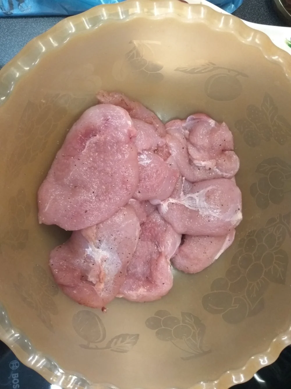 ШАГ 1 Филе индейки режем на тонкие пласты и выкладываем в миску, пересыпая специями и солью. Затем накрываем крышкой, сверху кладем какой-нибудь груз и оставляем мариноваться все на 25–30 минут.