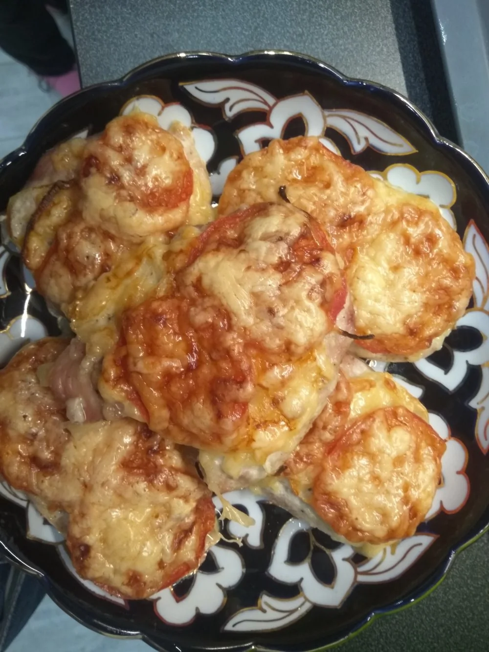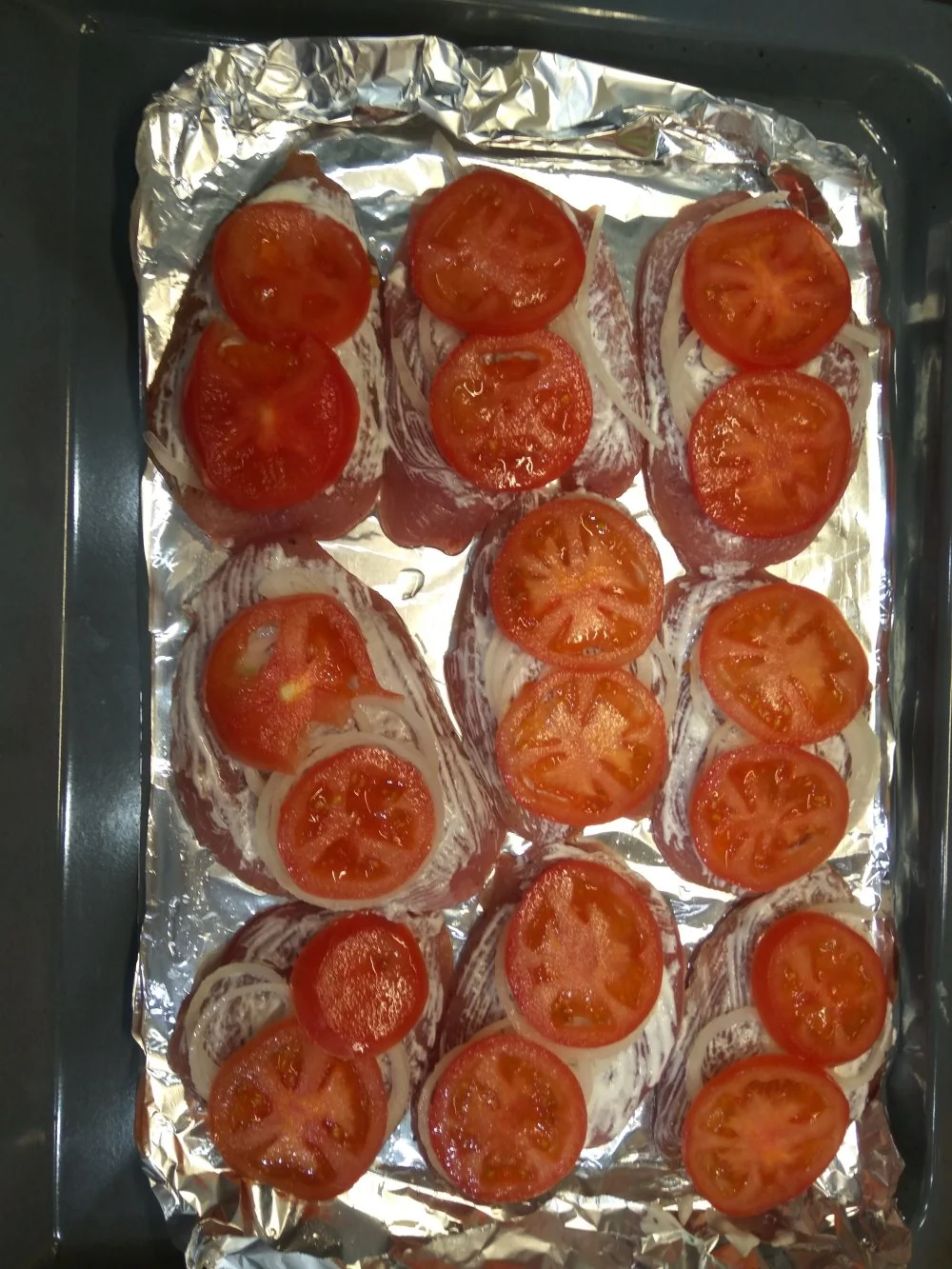 ШАГ 4 На противень выкладываем лист фольги. Равномерно, в один слой, раскладываем пласты индейки, сверху слегка промазываем майонезом. Затем кладем слой лука и слой помидоров. Сверху все засыпаем сыром. Запекаем в духовке около часа: сначала на сильном огне, затем — на слабом.