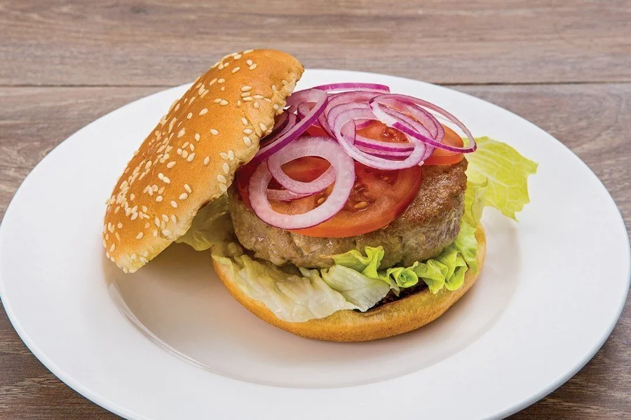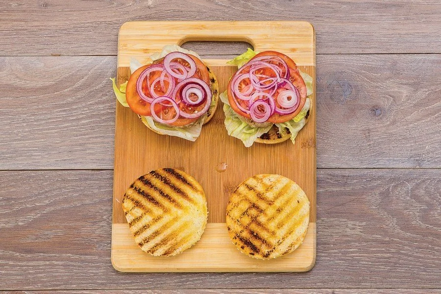 ШАГ 6 Смажьте булку оливковым маслом со стороны срезов и обжарьте на сковороде гриль на сильном огне до золотистого цвета; смажьте булку соусом, выложите салат, котлету, помидор и лук.