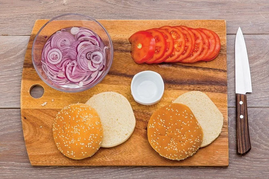 ШАГ 1 Очистите и нарежьте лук кольцами, залейте водой, добавьте уксус и оставьте мариноваться на 10 минут; нарежьте помидор кольцами, булку разрежьте на 2 части.