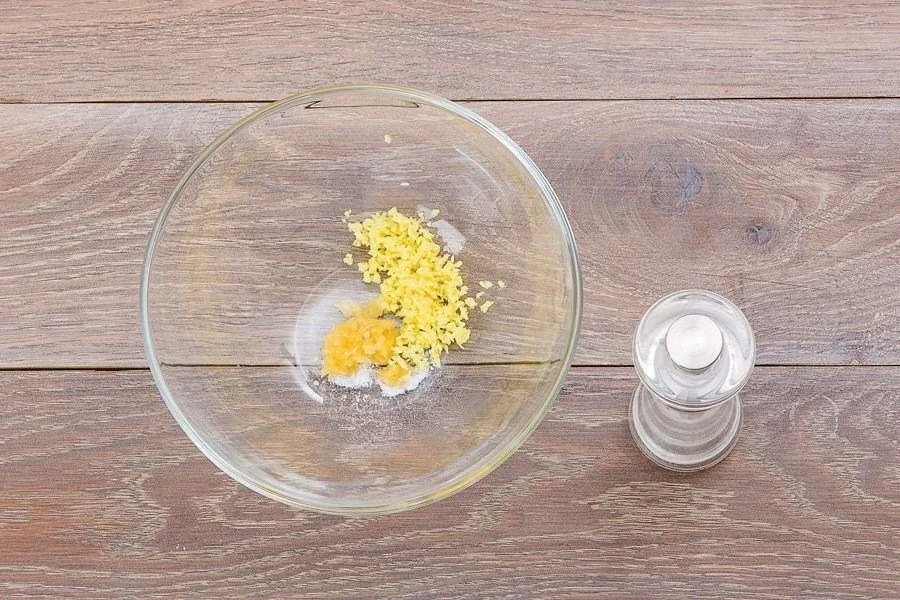 ШАГ 2 Раздавите, очистите и разотрите чеснок в пасту, очистите и натрите имбирь на мелкой терке; смешайте чеснок, имбирь и соль.