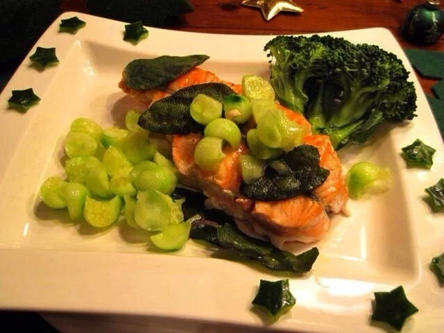 Ингредиенты для приготовления Филе лосося с огурцом и фритированными листьями шалфея:
