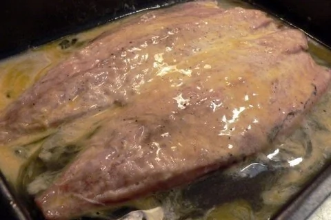ШАГ 1 Рыбу промыть, сделать разрез по брюшку. Удалить кости и хребет, аккуратно срезая ножом мякоть. Снять тонкую кожицу, покрывающую рыбу и аккуратно срезать спинные плавники, таким образом, чтобы плавники остались соединены между собой. Еще раз хорошо промыть.