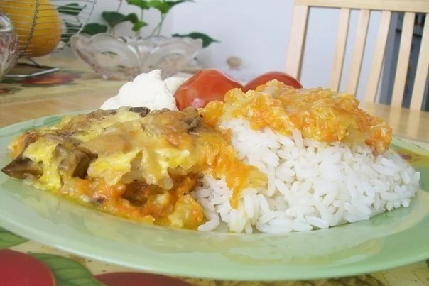 ШАГ 4 Выложить овощи в огнеупорную форму. На овощи выложить рыбу, тушеные грибы. Сверху добавить майонез и тертый сыр. Запекать в духовке, разогретой до 200 градусов около 20 минут.