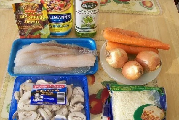Филе рыбы Лук Морковь Шампиньоны Растительное масло Тертый сыр Майонез Специи Основные блюда Европейская кухня